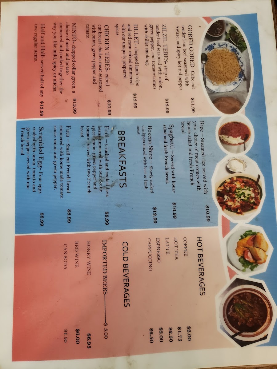 The menu is a delightful homage to traditional Ethiopian cuisine, featuring an array of dishes that will tantalize your taste buds. Start your experience with a cup of their traditional coffee—brewed from premium imported Ethiopian beans for just $3.50. The aroma alone is enough to awaken your senses, setting the tone for the delicious journey ahead. Pair that with a side of Aiyb, the exquisite Ethiopian-style cheese, which perfectly complements the meal with its creamy texture and rich flavor at only $3.99.